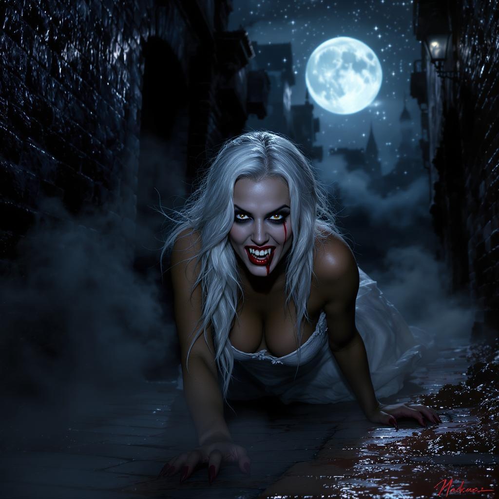 Extremely detailed CG unity 8k wallpaper portrait of a vampire woman poised to bite, set in a narrow, fog-laden Victorian back alley. Her striking white hair cascades around her face, contrasting with her tan skin illuminated by the moonlight. Wearing a tattered white dress, she crawls on the cobblestone ground, her predatory gaze fixed on the viewer. Vampire fangs gleam with fresh blood trickling from her open mouth, capturing a moment of both elegance and menace. The dramatic lighting accentuates her features, while a sea of stars twinkle in the night sky behind her, with a full moon casting an ethereal glow reminiscent of Greg Rutkowski's style.