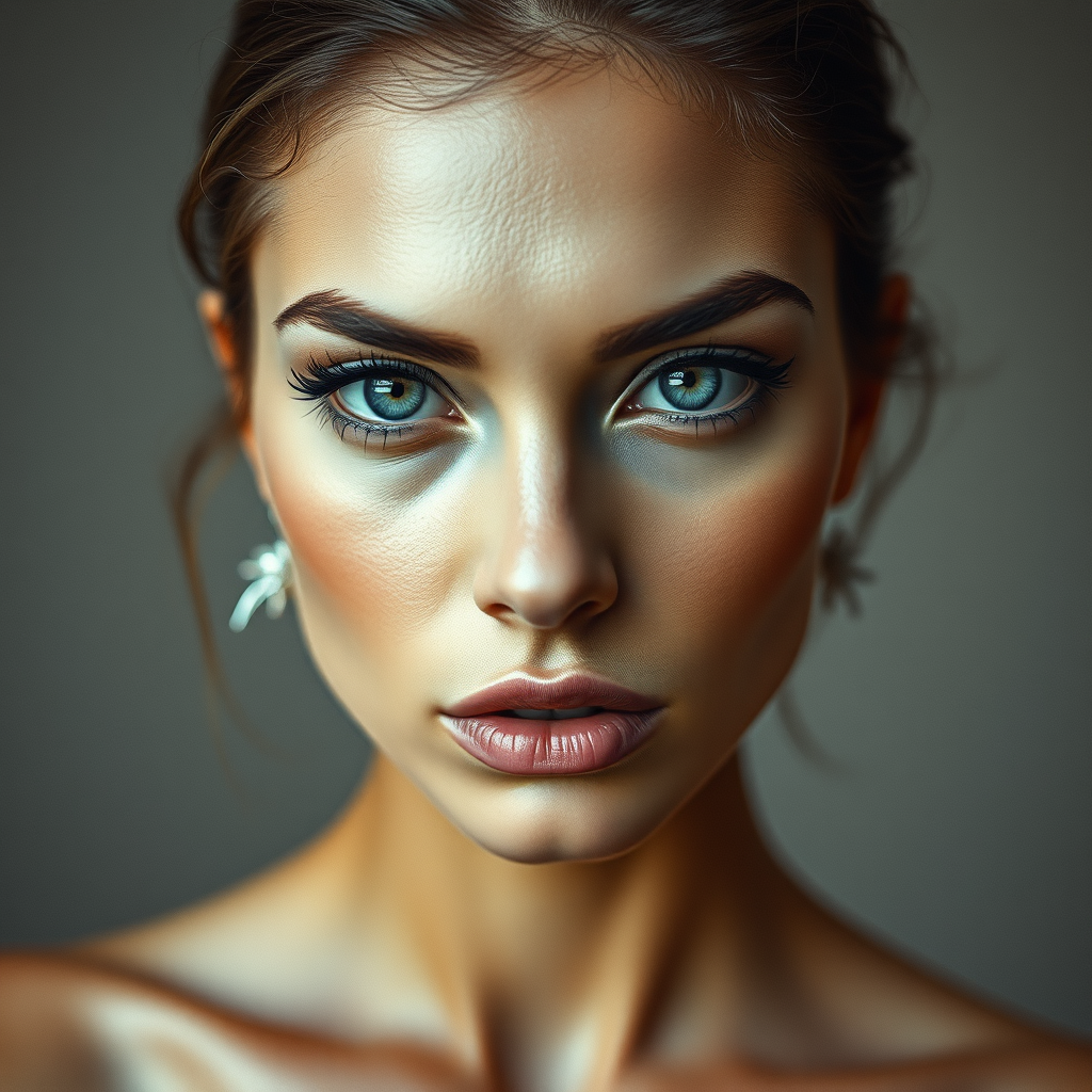 Extremely detailed, high-resolution image capturing film grain texture, featuring elegant and sophisticated results, daring makeup, shot in a refined studio setting, with an intense closeup capturing a direct gaze into the camera, standing confidently, showcasing remarkable beauty, rendered with artistic finesse, 8K quality, magnificent blue-gray eyes, elevated with subtle creative nuances for an exquisite visual experience.