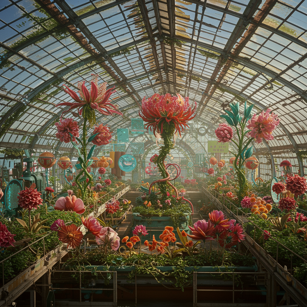 View this AI-generated image featuring eye level view photography of an expansive futuristic greenhouse filled with strange and delightful flowers showcasing vibrant colors and intricate details the scene combines the essence of cyberpunk featuring a triadic color palette with detailed shadows and a