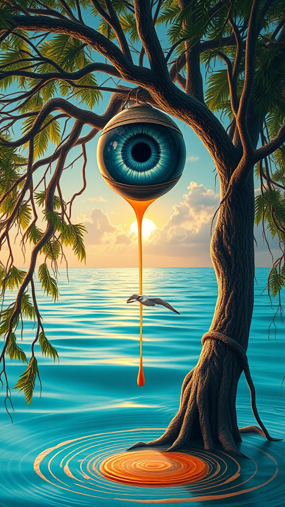 Eye of the Estuary: an oblong orb floats suspended in the upper branches of a mangrove tree, its iris a swirling vortex of indigo and gold,-stares out across a silken expanse of turquoise water, where the surface tension is broken by a lone seagull, its wingsuit a delicate latticework of downy feathers-as the light of the setting sun bleeds into the scene, a dripping, honey-colored paint seeps from the tree's trunk, pooling around the base, forming a hieroglyphic of ripples and concentric circles-like a mirror held up to the sky, the water's surface reflects the Eye's beauty, infusing the image with an otherworldly essence, as if the very fabric of reality is about to unfurl like a lotus bloom.