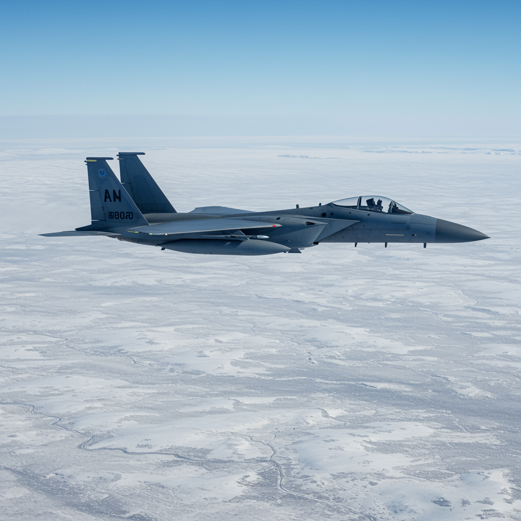 F-15S/MTD soaring gracefully over a vast, frozen tundra, its sleek frame cutting through the crisp Arctic air as the icy landscape below glimmers under the soft glow of the polar sunlight, casting long shadows over the endless expanse of snow and ice. The powerful fighter jet's engines leave a faint, swirling trail against the backdrop of a clear azure sky, merging the advanced marvel of modern aviation with the untouched serenity of the tundra.