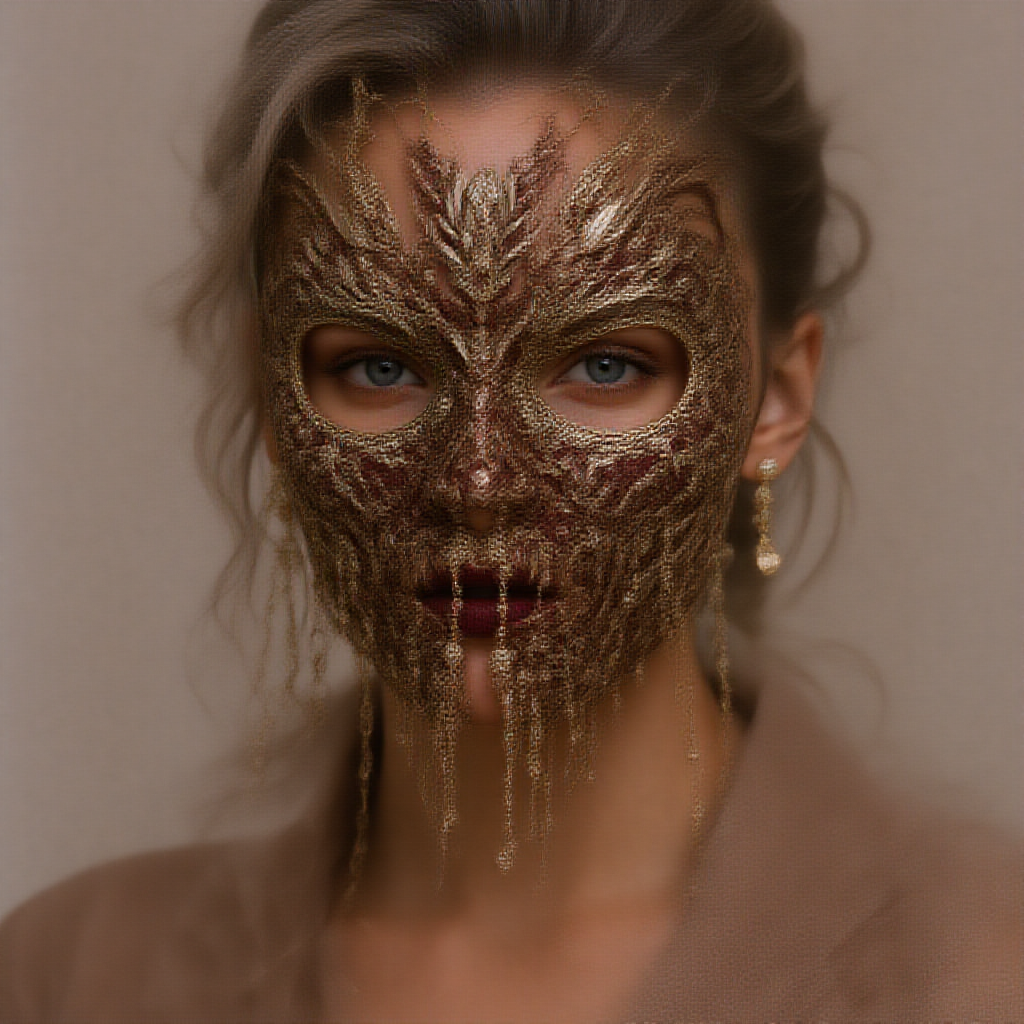 Face hugger-inspired luxury face mask by Louis Vuitton, elegantly designed for high fashion, captured in professional advert photography, featuring a sophisticated model showcasing the intricate details and opulent materials, emphasizing the fusion of avant-garde style and iconic brand elements, exuding exclusivity and allure.