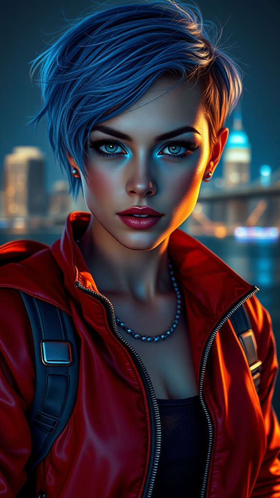 Face portrait, cinematic lighting, photorealistic, a girl resembling a blend of Grace Kelly and Kristen Stewart, wearing a cyberpunk outfit. She has short, sparkly blue hair, a fit physique, a red sports jacket, and striking blue makeup. The image features vibrant HDR colors and is set against the backdrop of the New York coast. Negative prompt: deformed anatomy, deformed face, crazy eyes, bad hands, deformed body. Adjustments: subtle creative elements while retaining the essence of the original concept.