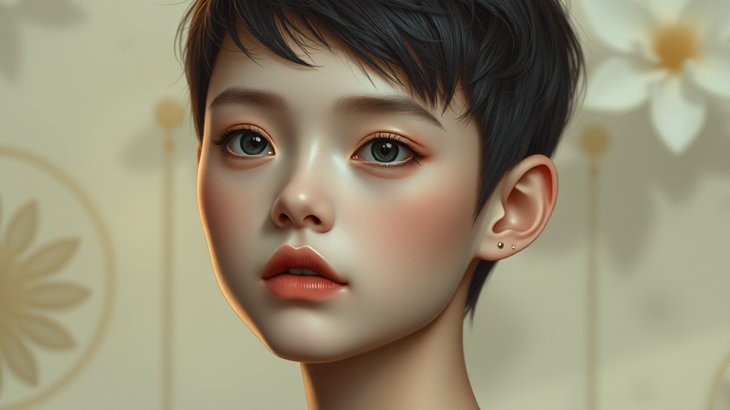 Face portrait of a young individual with short, stylish pixie hair, featuring intricate and highly detailed facial features. The image presents a full body shot, capturing the elegance and poise of the subject. The portrait is smooth and in sharp focus, showcasing the artistry and influence of concept artists Ruan Jia, Ilya Kuvshinov, Alphonse Mucha, and Rossdraws. The background blends with the subject, enhancing their presence while allowing for small creative flourishes, such as subtle patterns and soft lighting, adding depth and a dreamlike quality to the artwork.