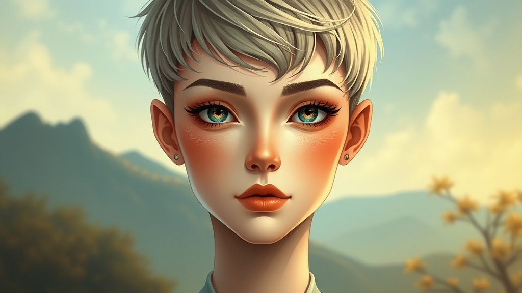 Face portrait of an androgynous character with a centered gaze, showcasing delicate and intricate details in the expression. Short pixie hair frames the face with a graceful touch, capturing a blend of whimsy and strength. The overall design is smooth and features a sharp focus, enhancing the details with clarity. This full-body shot is rendered with the elegance and stylistic influences of Ruan Jia, Ilya Kuvshinov, Alphonse Mucha, and Rossdraws, blending their unique styles into a cohesive whole. The background hints at a dreamlike landscape, subtly supporting the vivid presence of the character.