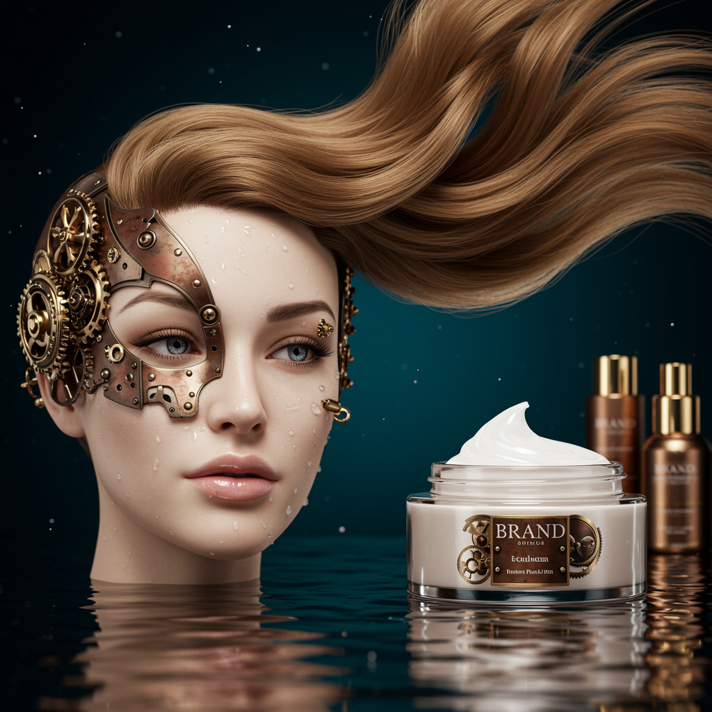 Face serum cosmetics infused with steampunk elements, featuring intricate, highly detailed design. Faces emerge from creams with octane render precision, bathed in immersive studio lighting. Capture the essence of luxurious face cream submerged in water, showcasing its fluid elegance. Set in an opulent cosmetics store backdrop with accents of body and hair care, highlighting strands of beautiful, flowing hair glistening like gold, set against an aura of sophistication and allure.