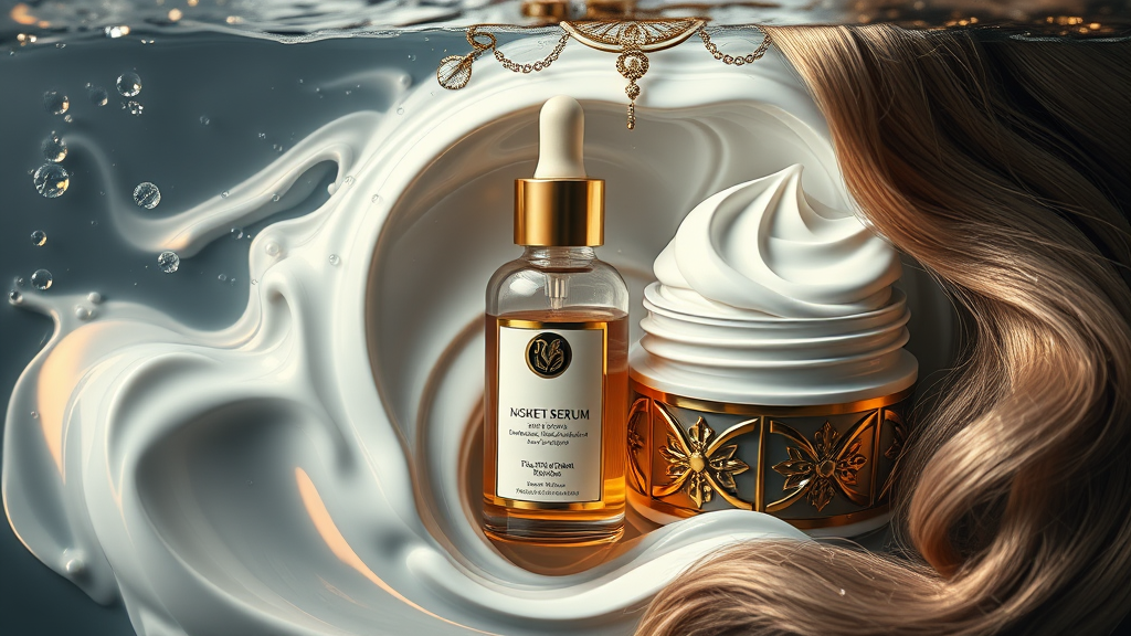 Face serum, luxurious cosmetics, rich face cream, intricately detailed, steampunk aesthetic, high-resolution render, sophisticated studio lighting, serum bottle, elegant cosmetics, opulent face cream, immersed in water, cream swirls in liquid, glamorous cosmetics boutique, premium body care, silky hair care, luscious hair, radiant locks, golden accents, exquisite design, enchanting allure.