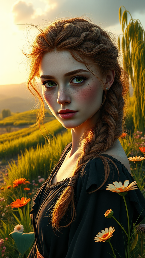 Face with detailed features, messy ginger hair, natural freckles, strong square jaw, intricate long braids, high cheekbones, sharp features, heart-shaped lips, wearing a long dark elegant dress, enchanting green eyes, hourglass figure, dynamic lighting in the golden hour, set in a beautiful and colorful landscape. The scene includes elements like weeping willows, vibrant green grass, and a variety of flowers, creating an earth art vibe. The setting is fantasy-like with a matte background, reminiscent of a detailed and elegant painting. The style is highly detailed and inspired by artists like Artgerm, Greg Rutkowski, Alphonse Mucha, and William-Adolphe Bouguereau. The composition features smooth and sharp focus, combining elements of illustration and photorealistic render in UHD and HDR quality, capturing a zoomed-out, full-body view of the character. The character exudes a vibe similar to a 'Lord of the Rings' bandit, with a slight emphasis on hyper-realism and high-quality detail.