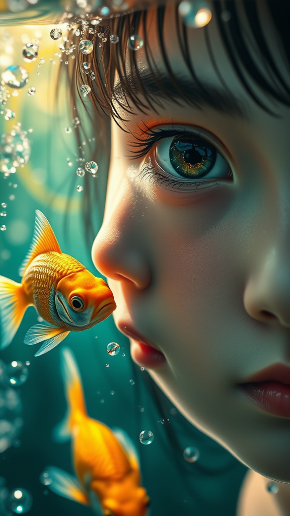 Facial close-up of a charming girl paired with vividly colored fish in a dreamlike scene, focusing on the girl's eyes and intricate details. The perspective captures half of her face immersed in water, evoking a makotoshinkai style with a nod to Otomo Katsuhiro's influence. Rendered in hyper-realistic detail, the scene features glowing elements in shades of yellow and blue, utilizing oil brush technique for texture. The exaggerated perspective highlights the Tyndall effect and shimmering water droplets, with mother-of-pearl iridescence and holographic hues of white against a lush green backdrop.