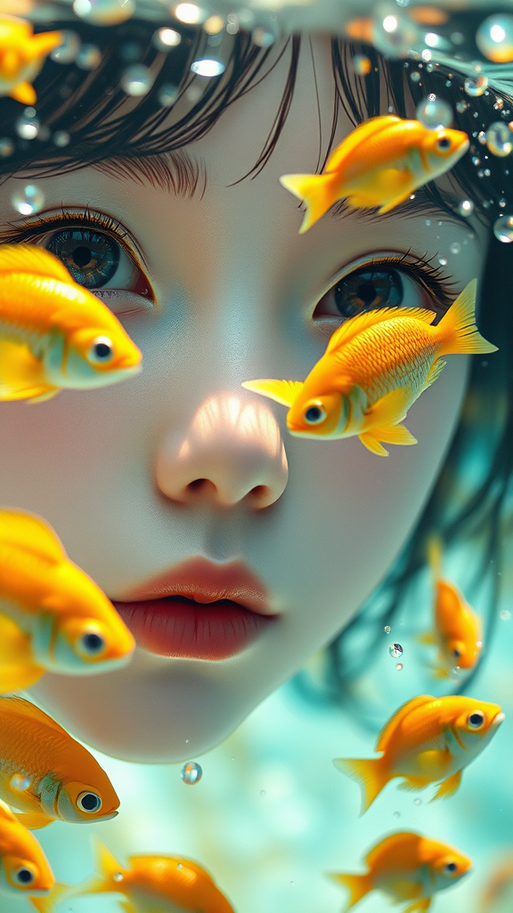 Facial close-up of a whimsical girl with a school of brightly colored fish, dreamy and enchanting, eyes in striking focus, front view. Half of her face is submerged in crystal-clear water, capturing the essence of Makoto Shinkai's style with a touch of Otomo Katsuhiro's influence. The scene boasts a hyper-realistic and intricately detailed render, her surroundings glowing with hues of yellow and blue. The perspective is slightly exaggerated, showcasing the Tyndall effect with droplets resembling mother-of-pearl iridescence. The background shimmers holographically in shades of white and a gentle green, while an ethereal light dances across the composition, creating a sense of magic and wonder.