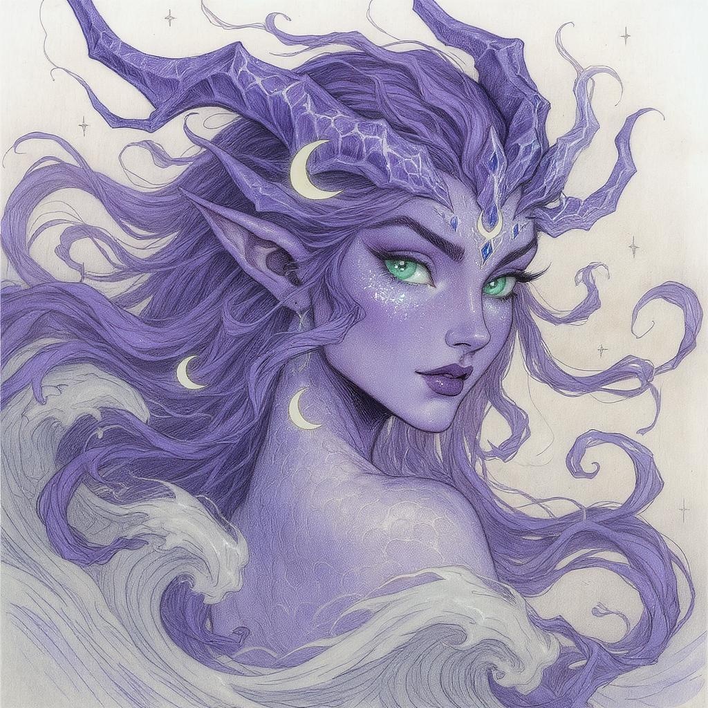 View this AI-generated image featuring a mystical fae with emerald eyes and shimmering amethyst scales adorned with enchanting crescent moon motifs set against a background of mysterious ethereal waves exuding a whimsical aura in the style of darwyn cooke s illustrative storytelling this enchanting