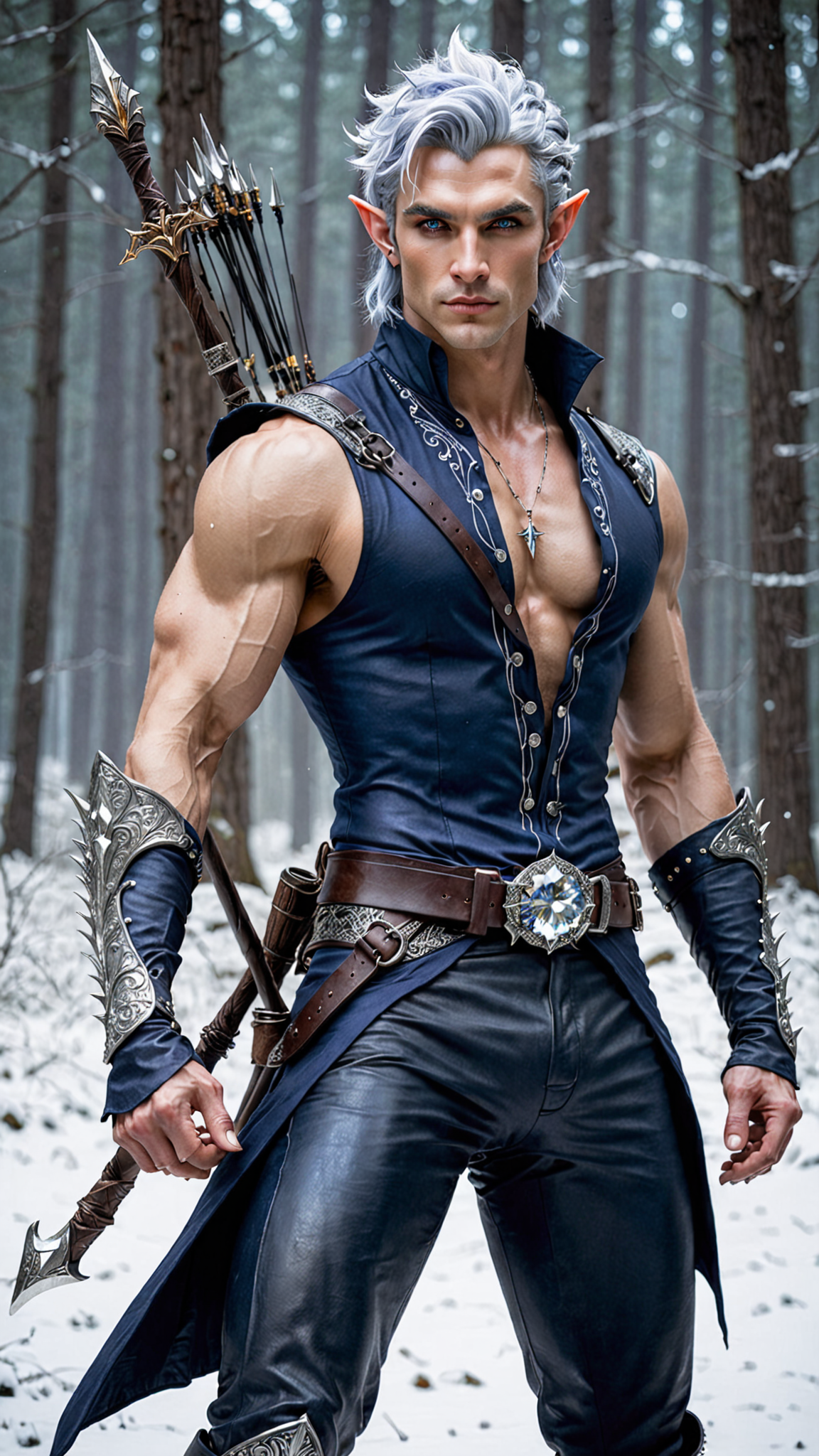 Faerie and Fantasy, The Dreaming. Elf. Moon Elf, pale white albino elf. Hypermasculine male. Short, stocky, wide shouldered, broad chested, narrow waist, sinewy, well defined. Strong, muscular. Pale white skin the color of snow, dusted in glittery moondust. Short length dark indigo-blue hair, short on sides and spiky on top. {{{SHORT HAIR,INDIGO BLUE}}}. Sparkling silver eyes, playful and cheery. Handsome masculine face, strong brow and chin, cleft in chin. Indigo-Blue soul-patch on face. Elf ears. His skin is dusted in silvery glitter. Silver talisman with crystal quartz pendant around his neck. Navy blue sleeveless shirt unbuttoned to navel, revealing his chest. Silver arm bands above his biceps, silver earring in left ear, along with silver ear cuffs. Black leather fingerless gloves, black leather bracers on arms. Black leather belt around waist, silver and sapphire belt buckle. Navy blue rangers pants/tights, form fitting and smooth over powerful legs and bulge in crotch. Soft gray boots, knee-high and slouchy/supple bucket boots. He holds a golden magical bow. He has a soft, silvery aura under moonlight, signifying elven magic. Full body pose, he is the archer, the Dream Archer.