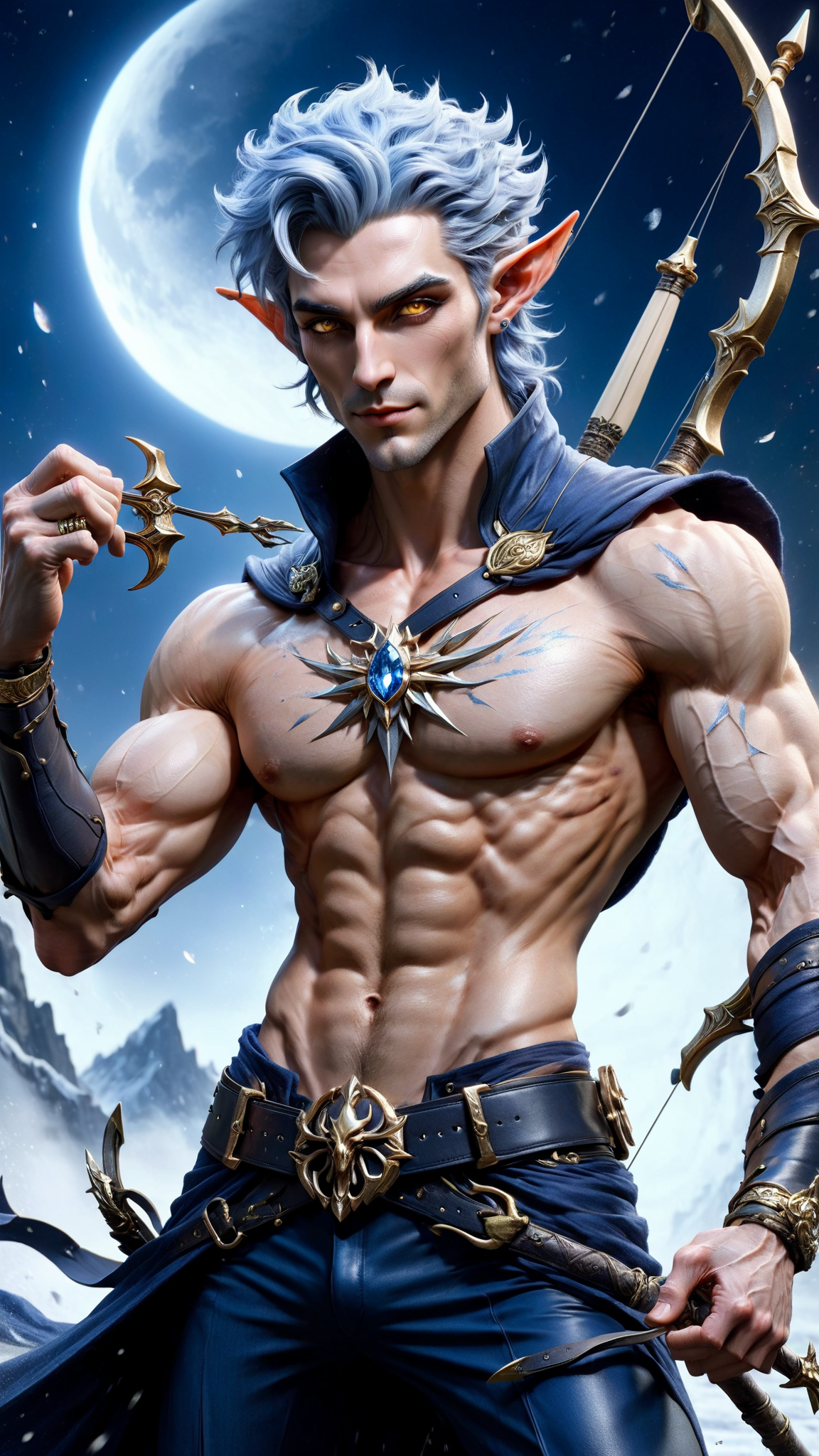 Faerie and Fantasy, The Dreaming. Elf. Moon Elf, pale white elf. Hypermasculine male. Short, stocky, wide shouldered, broad chested, narrow waist, sinewy, well defined. Strong, muscular. Pale white skin the color of snow, dusted in glittery moondust. Short length dark indigo-blue hair, short on sides and spiky on top. {{{SHORT HAIR, INDIGO BLUE HAIR}}}. Sparkling silver eyes, playful and cheery. Handsome masculine face, strong brow and chin, cleft in chin. Indigo-Blue soul-patch on face. Elf ears. His skin is dusted in silvery glitter. Silver talisman with crystal quartz pendant around his neck. Navy blue sleeveless shirt unbuttoned to navel, revealing his chest. Silver arm bands above his biceps, silver earring in left ear, along with silver ear cuffs. Black leather fingerless gloves, black leather bracers on arms. Black leather belt around waist, silver and sapphire belt buckle. Navy blue rangers pants/tights, form fitting and smooth over powerful legs and bulge in crotch. Soft gray boots, knee-high and slouchy/supple bucket boots. He holds a golden magical bow. He has a soft, silvery aura under moonlight, signifying elven magic. Full body pose, he is the archer, the Dream Archer.