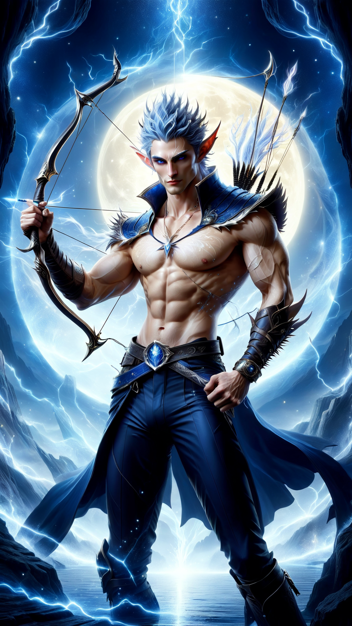 Faerie and Fantasy, The Dreaming. Elf. Moon Elf, pale white elf. Hypermasculine male. Short, stocky, wide shouldered, broad chested, narrow waist, sinewy, well defined. Strong, muscular. Pale white skin the color of snow, dusted in glittery moondust. Short length dark indigo-blue hair, short on sides and spiky on top. {{{SHORT HAIR, INDIGO BLUE HAIR}}}. Sparkling silver eyes, playful and cheery. Handsome masculine face, strong brow and chin, cleft in chin. Indigo-Blue soul-patch on face. Elf ears. His skin is dusted in silvery glitter. Silver talisman with crystal quartz pendant around his neck. Navy blue sleeveless shirt unbuttoned to navel, revealing his chest. Silver arm bands above his biceps, silver earring in left ear, along with silver ear cuffs. Black leather fingerless gloves, black leather bracers on arms. Black leather belt around waist, silver and sapphire belt buckle. Navy blue rangers pants/tights, form fitting and smooth over powerful legs and bulge in crotch. Soft gray boots, knee-high and slouchy/supple bucket boots. He holds a golden magical bow. He has a soft, silvery aura under moonlight, signifying elven magic. Full body pose, he is the archer, the Dream Archer.