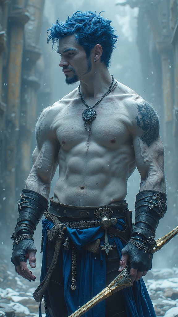 Faerie and Fantasy, The Dreaming. Elf. Moon Elf, pale white elf. Hypermasculine male. Short, stocky, wide shouldered, broad chested, narrow waist, sinewy, well defined. Strong, muscular. Pale white skin the color of snow, dusted in glittery moondust. Short length dark indigo-blue hair, short on sides and spiky on top. {{{SHORT HAIR, INDIGO BLUE HAIR}}}. Sparkling silver eyes, playful and cheery. Handsome masculine face, strong brow and chin, cleft in chin. Indigo-Blue soul-patch on face. Elf ears. His skin is dusted in silvery glitter. Silver talisman with crystal quartz pendant around his neck. Navy blue sleeveless shirt unbuttoned to navel, revealing his chest. Silver arm bands above his biceps, silver earring in left ear, along with silver ear cuffs. Black leather fingerless gloves, black leather bracers on arms. Black leather belt around waist, silver and sapphire belt buckle. Navy blue rangers pants/tights, form fitting and smooth over powerful legs and bulge in groin. Soft gray boots, knee-high and slouchy/supple bucket boots. He holds a golden magical bow. He has a soft, silvery aura under moonlight, signifying elven magic. Full body pose, he is the archer, the Dream Archer.