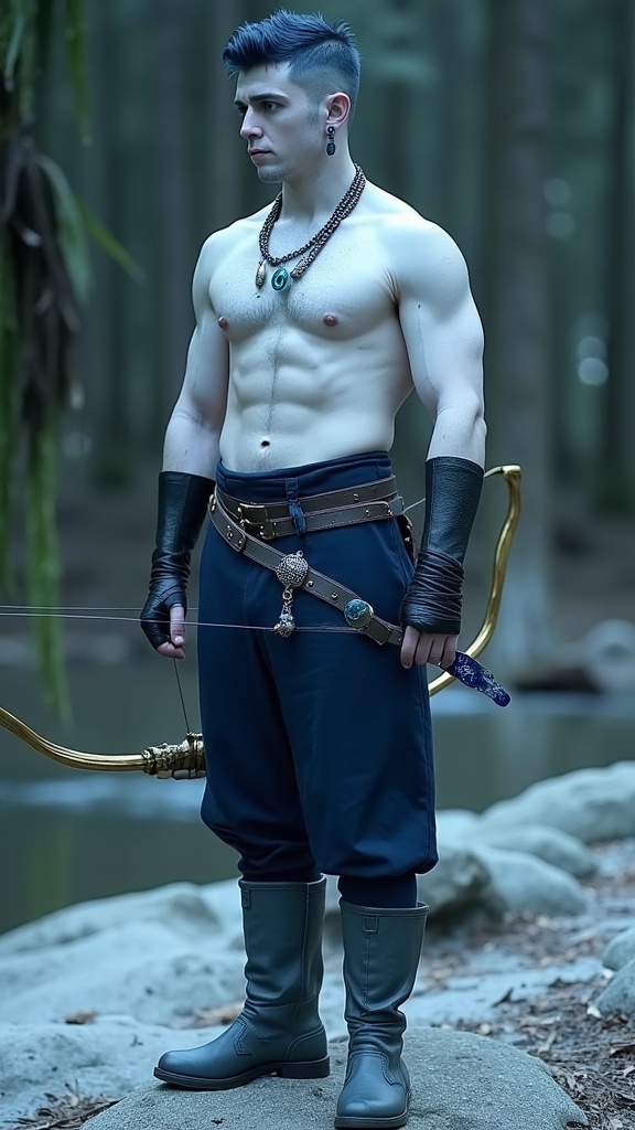 Faerie and Fantasy, The Dreaming. Elf. Moon Elf, pale white elf. Hypermasculine male. Short, stocky, wide shouldered, broad chested, narrow waist, sinewy, well defined. Strong, muscular. Pale white skin the color of snow, dusted in glittery moondust. Short length dark indigo-blue hair, short on sides and spiky on top. {{{SHORT HAIR, INDIGO BLUE HAIR}}}. Sparkling silver eyes, playful and cheery. Handsome rugged masculine face, strong brow and chin, cleft in chin. Indigo-Blue soul-patch on face below bottom lip. Sharp Elf ears. His skin is dusted in silvery glitter. Silver talisman with crystal quartz pendant around his neck. Navy blue sleeveless shirt unbuttoned to navel, revealing his chest. Silver arm bands above his biceps, silver earring in left ear, along with silver ear cuffs. Black leather fingerless gloves, black leather bracers on arms. Black leather belt around waist, silver and sapphire belt buckle. Navy blue rangers pants/tights, form fitting and smooth over powerful legs and bulge in groin. Soft gray boots, knee-high and slouchy/supple bucket boots. He holds a golden magical bow. He has a soft, silvery aura under moonlight, signifying elven magic. Full body pose, he is the archer, the Dream Archer.
