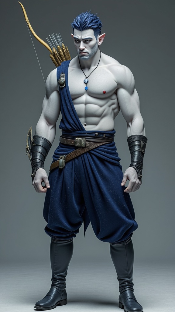 Faerie and Fantasy, The Dreaming. Elf. Moon Elf, pale white elf. Hypermasculine mature adult male. Short, stocky, wide shouldered, broad chested, narrow waist, sinewy, well defined. Strong, muscular. Pale white skin the color of snow, dusted in glittery moondust. Short length dark indigo-blue hair, short on sides and spiky on top. {{{SHORT HAIR, INDIGO BLUE HAIR}}}. Sparkling silver eyes, playful and cheery. Handsome rugged masculine face, strong brow and chin, cleft in chin. Indigo-Blue soul-patch on face below bottom lip. Sharp Elf ears. His skin is dusted in silvery glitter. Silver talisman with crystal quartz pendant around his neck. Navy blue sleeveless shirt unbuttoned to navel, revealing his chest. Silver arm bands above his biceps, silver earring in left ear, along with silver ear cuffs. Black leather fingerless gloves, black leather bracers on arms. Black leather belt around waist, silver and sapphire belt buckle. Navy blue rangers pants/tights, form fitting and smooth over powerful legs and bulge in groin. Soft gray boots, knee-high and slouchy/supple bucket boots. He holds a golden magical bow. He has a soft, silvery aura under moonlight, signifying elven magic. Full body pose, he is the archer, the Dream Archer.