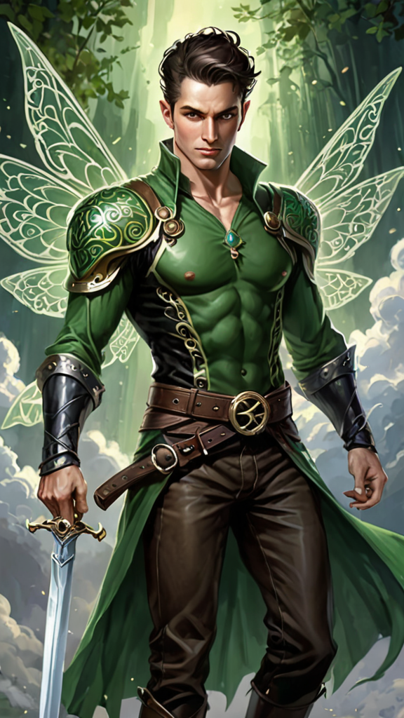 Faery of Celtic/Irish origins. Fairy, part pixie. Swordsman, warrior. Short and stocky, but muscular, very well built. Masculine Caucasian male. Broad shoulders, broad chest, narrow waist. Fair skinned, twinkling jade green eyes. Very short dark brown hair, usually slicked back/combed back with a green velvet stovepipe tophat on top of his head. Handsome face, rugged looks. Strong brow and chin, dark brown goatee on his face, cute smile. He wears a long sleeved translucent sheer green mesh shirt with swirly patterns in various shades of green; it fits tight across his chest. Black leather bracers on his arms, a black leather studded belt around his waist. The belt has a huge green emerald belt buckle. Form-fitting green jeans, the legs tucked into tall black leather boots with silver buckles. He has a pair of huge dragonfly wings, green and translucent--he uses them to fly. He glows with a shiny green aura and leaves a trail of twinkling green pixie dust wherever he goes. It twinkles like stars. He carries a glowing silver short sword, the hilt decorated with emeralds. Full body pose, flying through the clouds, rainbows in the sky.