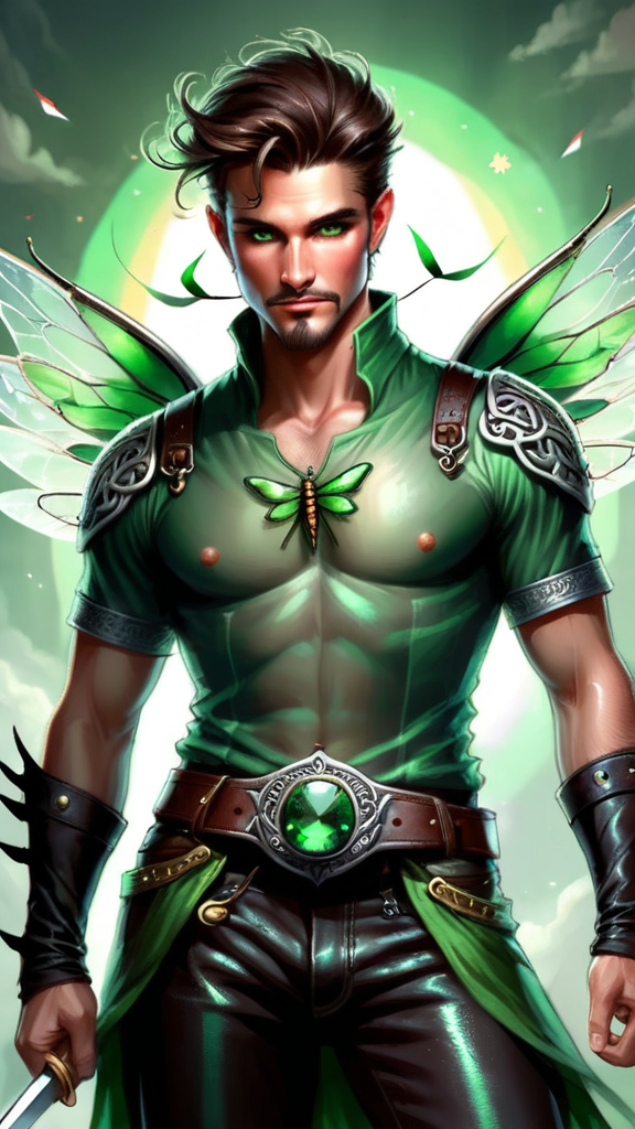 Faery of Celtic/Irish origins. Fairy, part pixie. Swordsman, warrior. Short and stocky, but muscular, very well built. Masculine Caucasian male. Broad shoulders, broad chest, narrow waist. Fair skinned, twinkling jade green eyes. Very short dark brown hair, usually slicked back/combed back with a green velvet stovepipe tophat on top of his head. Handsome face, rugged looks. Strong brow and chin, dark brown goatee on his face, cute smile. He wears a long sleeved translucent sheer green mesh shirt with swirly patterns in various shades of green; it fits tight across his chest. Black leather bracers on his arms, a black leather studded belt around his waist. The belt has a huge green emerald belt buckle. Form-fitting green jeans, the legs tucked into tall black leather boots with silver buckles. He has a pair of huge dragonfly wings, green and translucent--he uses them to fly. He glows with a shiny green aura and leaves a trail of twinkling green pixie dust wherever he goes. It twinkles like stars. He carries a glowing silver short sword, the hilt decorated with emeralds. Full body pose, flying through the clouds, rainbows in the sky.
