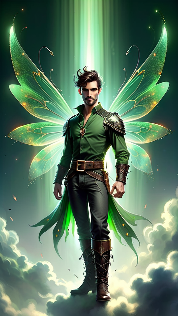 Faery of Celtic/Irish origins. Fairy, part pixie. Swordsman, warrior. Short and stocky, but muscular, very well built. Masculine Caucasian male. Broad shoulders, broad chest, narrow waist. Fair skinned, twinkling jade green eyes. Very short dark brown hair, usually slicked back/combed back with a green velvet stovepipe tophat on top of his head. Handsome face, rugged looks. Strong brow and chin, dark brown goatee on his face, cute smile. He wears a long sleeved translucent sheer green mesh shirt with swirly patterns in various shades of green; it fits tight across his chest. Black leather bracers on his arms, a black leather studded belt around his waist. The belt has a huge green emerald belt buckle. Form-fitting green jeans, the legs tucked into tall black leather boots with silver buckles. He has a pair of huge dragonfly wings, green and translucent--he uses them to fly. He glows with a shiny green aura and leaves a trail of twinkling green pixie dust wherever he goes. It twinkles like stars. He carries a glowing silver short sword, the hilt decorated with emeralds. Full body pose, flying through the clouds, rainbows in the sky.