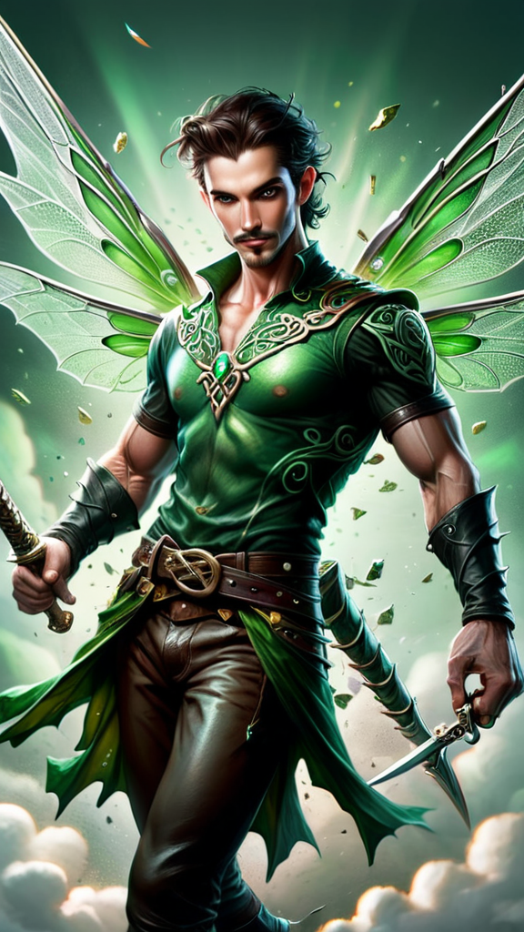 Faery of Celtic/Irish origins. Fairy, part pixie. Swordsman, warrior. Short and stocky, but muscular, very well built. Masculine Caucasian male. Broad shoulders, broad chest, narrow waist. Fair skinned, twinkling jade green eyes. Very short dark brown hair, usually slicked back/combed back with a green velvet stovepipe tophat on top of his head. Handsome face, rugged looks. Strong brow and chin, dark brown goatee on his face, cute smile. He wears a long sleeved translucent sheer green mesh shirt with swirly patterns in various shades of green; it fits tight across his chest. Black leather bracers on his arms, a black leather studded belt around his waist. The belt has a huge green emerald belt buckle. Form-fitting green jeans, the legs tucked into tall black leather boots with silver buckles. He has a pair of huge dragonfly wings, green and translucent--he uses them to fly. He glows with a shiny green aura and leaves a trail of twinkling green pixie dust wherever he goes. It twinkles like stars. He carries a glowing silver short sword, the hilt decorated with emeralds. Full body pose, flying through the clouds, rainbows in the sky.