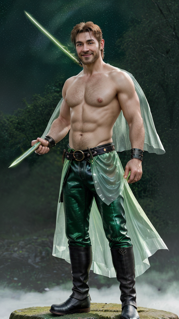Faery of Celtic/Irish origins. Fairy, part pixie. Swordsman, warrior. Short and stocky, but muscular, very well built. Masculine Caucasian male. Broad shoulders, broad chest, narrow waist. Fair skinned, twinkling jade green eyes. Very short dark brown hair, usually slicked back/combed back with a green velvet stovepipe tophat on top of his head. Handsome face, rugged looks. Strong brow and chin, dark brown goatee on his face, cute smile. He wears a long sleeved translucent sheer green mesh shirt with swirly patterns in various shades of green; it fits tight across his chest. Black leather bracers on his arms, a black leather studded belt around his waist. The belt has a huge green emerald belt buckle. Form-fitting green jeans, the legs tucked into tall black leather boots with silver buckles. He has a pair of huge dragonfly wings, green and translucent--he uses them to fly. He glows with a shiny green aura and leaves a trail of twinkling green pixie dust wherever he goes. It twinkles like stars. He carries a glowing silver short sword, the hilt decorated with emeralds. Full body pose, flying through the clouds, rainbows in the sky.