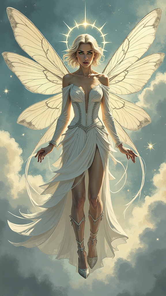Faery Queen, archangel powers. Sylph, fairy-angel. Regal, royal, elegant, ethereal, Cosmic, universal. Feminine female. Beautiful young face, chartreuse green eyes with long blond lashes; her eyes glow with the power of Heaven. Short white-gold hair, side swept on one side and swept up locks falling to one side. Over her head is a halo made of shining stars {{{shining star halo}}} with the center star being the brightest. Elvish ears. Delicate model face with glossy pink lips. A white lace collar with a diamond at the center around her neck. She wears a white, royal off-shoulder long sleeved tiered gown, embedded with crystals, a silver belt with diamonds around her waist. Her dress sparkles and shimmers, the tiered bottom half of her dress is shorter on the sides, revealing long lovely legs. Flowing, windswept long pieces on the bottom portion of the dress. On her back is an enormous, over-sized pair of dragonfly wings, transparent and iridescent with all the rainbow colors (((all rainbow colors))). She wears a pair of silver high heels with silver gladiator straps. She leaves a cloud of sparkly glitter wherever she flys, and is constantly surrounded by sprites of both sexes. She shines with a silver light/aura. Full body pose, flying through the clouds, greeting the dawn.