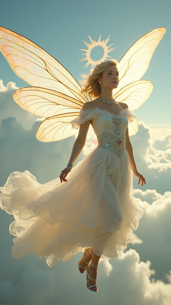 Faery Queen, archangel powers. Sylph, fairy-angel. Regal, royal, elegant, ethereal, Cosmic, universal. Feminine female. Beautiful young face, chartreuse green eyes with long blond lashes; her eyes glow with the power of Heaven. Short white-gold hair, side swept on one side and swept up locks falling to one side. Over her head is a halo made of shining stars {{{shining star halo}}} with the center star being the brightest. Elvish ears. Delicate model face with glossy pink lips. A white lace collar with a diamond at the center around her neck. She wears a white, royal off-shoulder long sleeved tiered gown, embedded with crystals, a silver belt with diamonds around her waist. Her dress sparkles and shimmers, the tiered bottom half of her dress is shorter on the sides, revealing long lovely legs. Flowing, windswept long pieces on the bottom portion of the dress. On her back is an enormous, over-sized pair of dragonfly wings, transparent and iridescent with all the rainbow colors (((all rainbow colors))). She wears a pair of silver high heels with silver gladiator straps. She leaves a cloud of sparkly glitter wherever she flys, and is constantly surrounded by sprites of both sexes. She shines with a silver light/aura. Full body pose, flying through the clouds, greeting the dawn.