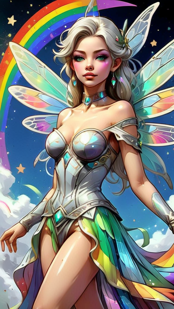 Faery Queen, archangel powers. Sylph, fairy-angel. Regal, royal, elegant, ethereal, Cosmic, universal. Feminine female. Beautiful young face, chartreuse green eyes with long blond lashes; her eyes glow with the power of Heaven. Short white-gold hair, side swept on one side and swept up locks falling to one side. Over her head is a halo made of shining stars {{{shining star halo}}} with the center star being the brightest. Elvish ears. Delicate model face with glossy pink lips. A white lace collar with a diamond at the center around her neck. She wears a white, royal off-shoulder long sleeved tiered gown, embedded with crystals, a silver belt with diamonds around her waist. Her dress sparkles and shimmers, the tiered bottom half of her dress is shorter on the sides, revealing long lovely legs. Flowing, windswept long pieces on the bottom portion of the dress. On her back is an enormous, over-sized pair of dragonfly wings, transparent and iridescent with all the rainbow colors (((all rainbow colors))). She wears a pair of silver high heels with silver gladiator straps. She leaves a cloud of sparkly glitter wherever she flys, and is constantly surrounded by sprites of both sexes. She shines with a silver light/aura. Full body pose, flying through the clouds, greeting the dawn.