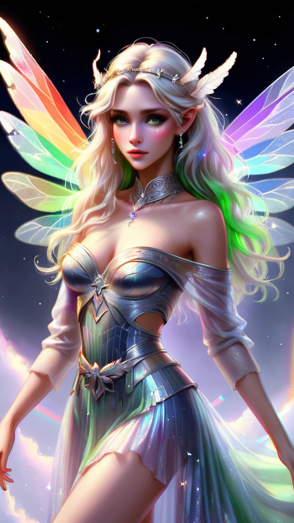 Faery Queen, archangel powers. Sylph, fairy-angel. Regal, royal, elegant, ethereal, Cosmic, universal. Feminine female. Beautiful young face, chartreuse green eyes with long blond lashes; her eyes glow with the power of Heaven. Short white-gold hair, side swept on one side and swept up locks falling to one side. Over her head is a halo made of shining stars {{{shining star halo}}} with the center star being the brightest. Elvish ears. Delicate model face with glossy pink lips. A white lace collar with a diamond at the center around her neck. She wears a white, royal off-shoulder long sleeved tiered gown, embedded with crystals, a silver belt with diamonds around her waist. Her dress sparkles and shimmers, the tiered bottom half of her dress is shorter on the sides, revealing long lovely legs. Flowing, windswept long pieces on the bottom portion of the dress. On her back is an enormous, over-sized pair of dragonfly wings, transparent and iridescent with all the rainbow colors (((all rainbow colors))). She wears a pair of silver high heels with silver gladiator straps. She leaves a cloud of sparkly glitter wherever she flys, and is constantly surrounded by sprites of both sexes. She shines with a silver light/aura. Full body pose, flying through the clouds, greeting the dawn.