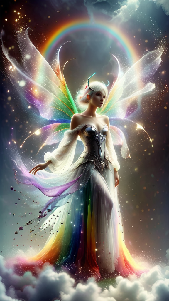 Faery Queen, archangel powers. Sylph, fairy-angel. Regal, royal, elegant, ethereal, Cosmic, universal. Feminine female. Beautiful young face, chartreuse green eyes with long blond lashes; her eyes glow with the power of Heaven. Short white-gold hair, side swept on one side and swept up locks falling to one side. Over her head is a halo made of shining stars {{{shining star halo}}} with the center star being the brightest. Elvish ears. Delicate model face with glossy pink lips. A white lace collar with a diamond at the center around her neck. She wears a white, royal off-shoulder long sleeved tiered gown, embedded with crystals, a silver belt with diamonds around her waist. Her dress sparkles and shimmers, the tiered bottom half of her dress is shorter on the sides, revealing long lovely legs. Flowing, windswept long pieces on the bottom portion of the dress. On her back is an enormous, over-sized pair of dragonfly wings, transparent and iridescent with all the rainbow colors (((all rainbow colors))). She wears a pair of silver high heels with silver gladiator straps. She leaves a cloud of sparkly glitter wherever she flys, and is constantly surrounded by sprites of both sexes. She shines with a silver light/aura. Full body pose, flying through the clouds, greeting the dawn.
