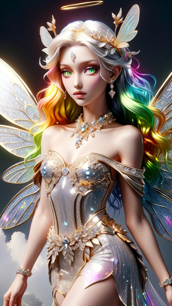 Faery Queen, archangel powers. Sylph, fairy-angel. Regal, royal, elegant, ethereal, Cosmic, universal. Feminine female. Beautiful young face, chartreuse green eyes with long blond lashes; her eyes glow with the power of Heaven. Short white-gold hair, side swept on one side and swept up locks falling to one side. Over her head is a halo made of shining stars {{{shining star halo}}} with the center star being the brightest. Elvish ears. Delicate model face with glossy pink lips. A white lace collar with a diamond at the center around her neck. She wears a white, royal off-shoulder long sleeved tiered gown, embedded with crystals, a silver belt with diamonds around her waist. Her dress sparkles and shimmers, the tiered bottom half of her dress is shorter on the sides, revealing long lovely legs. Flowing, windswept long pieces on the bottom portion of the dress. On her back is an enormous, over-sized pair of dragonfly wings, transparent and iridescent with all the rainbow colors (((all rainbow colors))). She wears a pair of silver high heels with silver gladiator straps. She leaves a cloud of sparkly glitter wherever she flys, and is constantly surrounded by sprites of both sexes. She shines with a silver light/aura. Full body pose, flying through the clouds, greeting the dawn.
