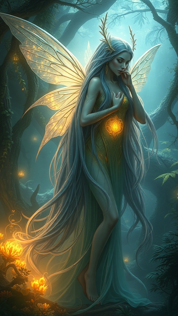 A mystical fairy with cascading long hair illuminated by the glow of an enchanted forest, surrounded by ethereal light and intricate foliage, detailed illustration, digital art, full-body character concept, inspired by the artistic styles of Dan Mumford, Peter Mohrbacher, and Greg Rutkowski. The scene captures a fantasy character in intricate detail, with vibrant colors and textures, creating a dreamlike atmosphere, hd, 4k, trending on ArtStation, featuring an otherworldly yet captivating presence in the heart of nature.