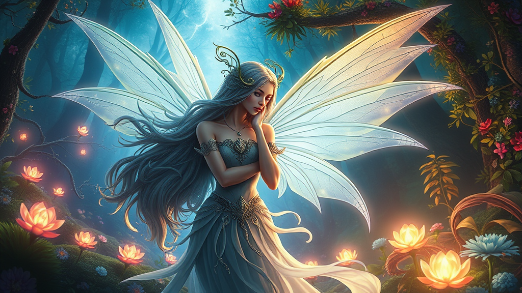 Fairy with ethereal wings in a luminous, enchanted forest, intricately detailed digital illustration, showcasing a full body portrait with flowing, cascading hair, inspired by the styles of Dan Mumford, Peter Mohrbacher, and Greg Rutkowski. Fantasy character design with ornate decorations, surrounded by a vibrant landscape teeming with magical flora and fauna. Emphasis on high-definition, 4k clarity, and rich textures, embodying an imaginative concept art piece that trends on ArtStation. The scene captures the mystical essence and elegance of the fairy, enhancing the enchanting atmosphere.
