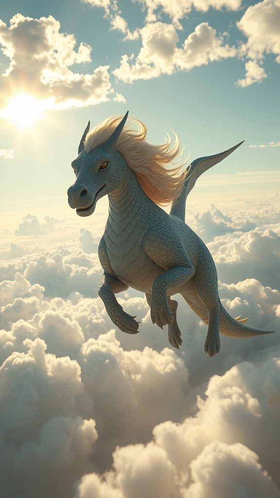 Falkor soaring grandly amidst the clouds of a fantasy realm, capturing the essence of The NeverEnding Story, featuring finely detailed scales and expressions, viewed from a sweeping ultra wide angle. Soft cinematic lighting enhances the ethereal ambiance, casting gentle shadows that highlight the textures in the sky and Falkor's flowing mane, while the sun's rays peek through the clouds, creating a magical and timeless atmosphere.