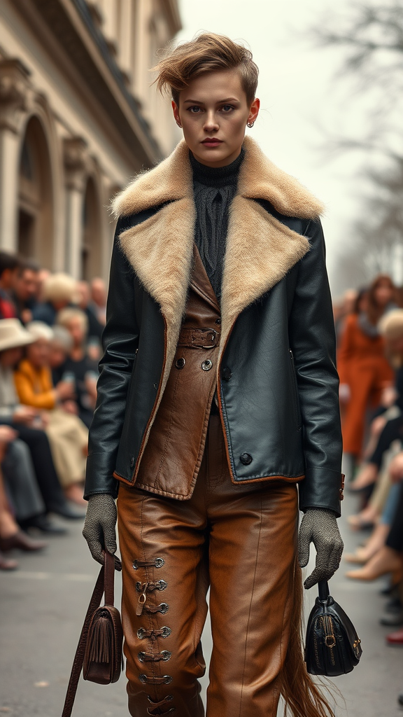 Fall 2017 Paris Fashion Week, inspired by Irving Penn's photography, with ivory hues and a poodlepunk twist, capturing the essence of 1860–1969 fashion. Incorporating leather and hide textures, reminiscent of Richard Doyle's illustrative style, features a ready-made aesthetic. The scene is set with a vertical 2:3 aspect ratio, exuding a raw, unrefined elegance with subtle creative flourishes.