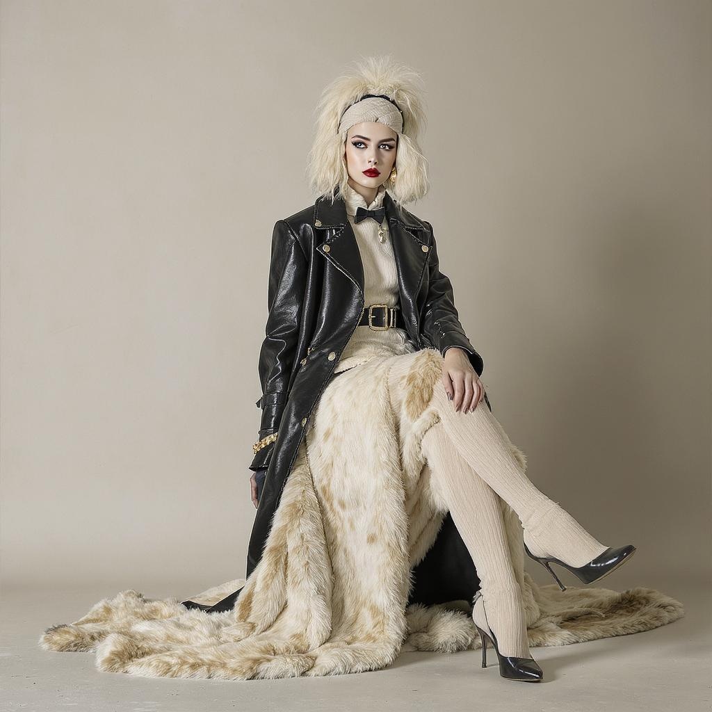 Fall 2017 Paris Fashion Week inspired scene, capturing the elegance in the style of Irving Penn, with an ivory palette. Embrace a blend of poodlepunk flair and vintage influences from 1860 to 1969. Highlight the texture and warmth of leather and hide elements, drawing subtly from Richard Doyle’s whimsical illustrations. Showcase a ready-made fashion ensemble that embodies striking contrast, poised against a backdrop reminiscent of raw studio photography. The overall composition should be vertical, emphasizing details and movement with an air of sophistication.