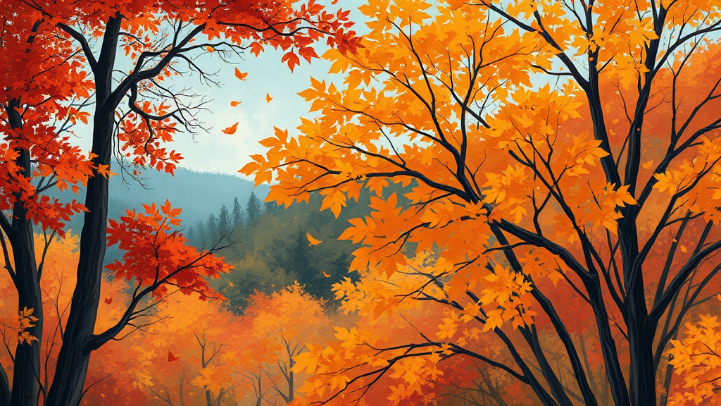 Fall-inspired digital painting with lush brushstrokes, evoking the vibrant essence of autumn. Influenced by Sophie Wilkins and Irene Sheri, blended with Naoto Hattori's unique vision, this piece channels the chic and intricate details of pointillism. Set in a 1970s aesthetic, the artwork captures the warmth of autumn foliage, with a touch of whimsy and surrealism. Radiating an elegant sophistication, it merges classic and modern styles seamlessly.
