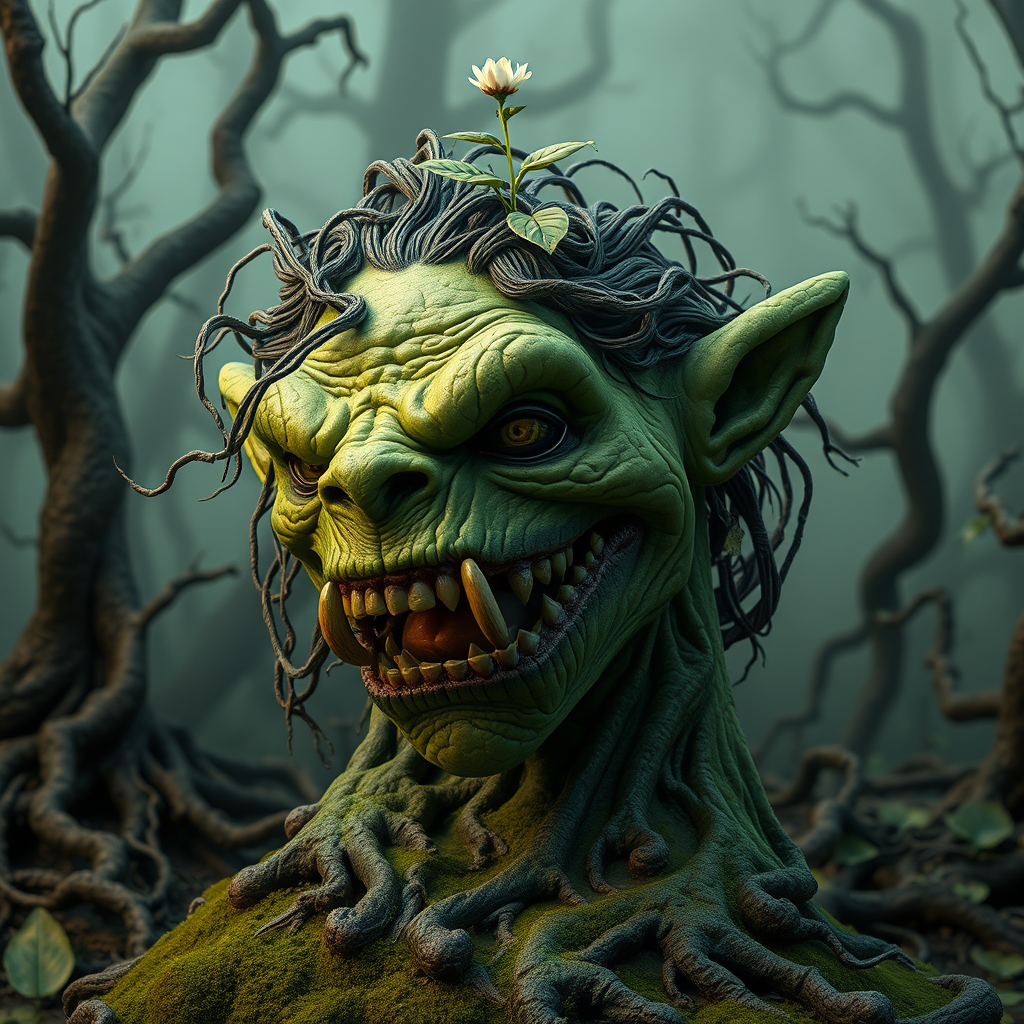 fanciful troll sculpture rendered in photorealistic hyper detail with vibrant hdr lighting within the Unreal Engine, created by a self-proclaimed bad artist who prefers the imperfect, textured, and slightly unsettling realism of their troll's gnarled green skin, sharp, yet fragile-looking teeth, and piercing yellow eyes that seem to gleam with a sinister intelligence, against a backdrop of murky, mist-shrouded forest, where twisted tree roots and gnarled branches writhe like living serpents, as if the very landscape itself has been twisted and corrupted by the troll's presence, with a special emphasis on the rough, scaly texture of the troll's skin and the way it seems to absorb and reflect the faint, emerald-green glow of the surrounding environment, all against a backdrop of oppressive, overcast skies that cast long, ominous shadows across the landscape, and a final flourish of a tiny, delicate flower sprouting from the troll's tangled hair, adding a touch of poignant, almost-mocking whimsy to the creature's otherwise fearsome appearance.