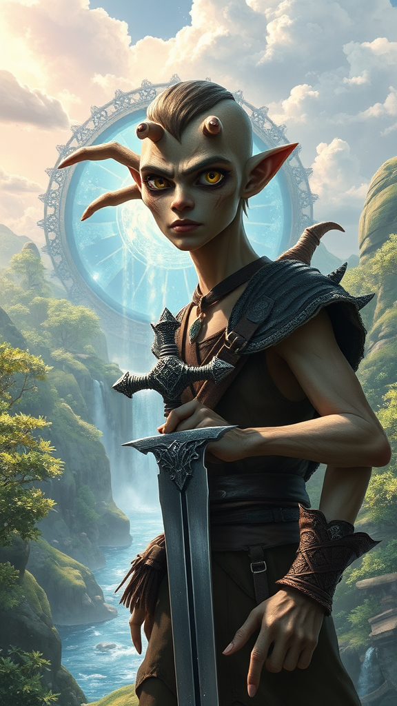 Fantasy adventurer, Ren the Wanderer, stands in front of a shimmering portal to the realm of Elyria, a world of lush forests, shimmering waterfalls, and radiant skies. Detached from the rest of their face, two eyes stare in opposite directions, giving the appearance of a cross-eyed expression, while seven fingers grasp the hilt of a sword, five on the left hand and two on the right, which appears to be a mutation. Region details, lush, green foliage, glistening, minute, droplets of water, in the light. The left shoulder and arm are left off frame as the rest of the body is rendered, showcasing a neck that stretches beyond natural proportions. Background and foreground details; layered rolling hills, glimmering clouds, energetic flora, winding streams all add vibrancy to Elyria.