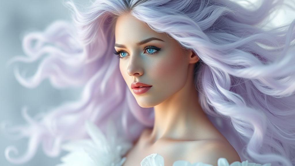 Fantasy celestial empress with flowing hair made of clouds photorealistic natural light macro focus ethereal lavender tones cool mint hues full body composition pastel ambiance pale porcelain skin dreamy atmosphere soft depth of field --ar 1:2 --v 4 --stylize 1000