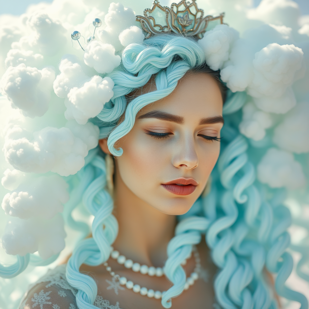 Fantasy celestial empress with hair of ethereal clouds, photorealistic, natural illumination, captured through a macro lens, inspired by Frida Kahlo, featuring a palette of baby blue, mint, and pastel hues, intertwined with white elements, with serene skin tones, depth of field effect, aspect ratio of 1:2, highly stylized at level 1000.