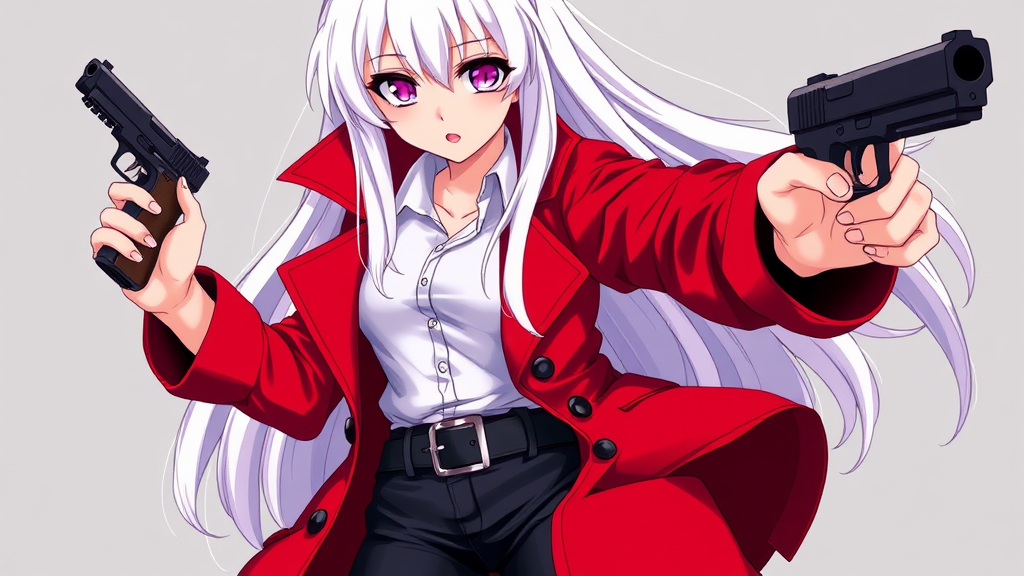 Fantasy female character, anime style, full body, digital art, high quality, HD, long white hair, striking purple eyes, clear face. She wears a stylish red trench coat over a white shirt, paired with black pants, black boots, and a black belt. In her right hand, she confidently holds a pistol. Her eyes are captivating, face cute yet enchanting with red lips, displaying a seductive expression. The artwork is vibrant and colorful, maintaining good proportions with detailed hands and features well-drawn, ensuring a polished and visually appealing appearance.