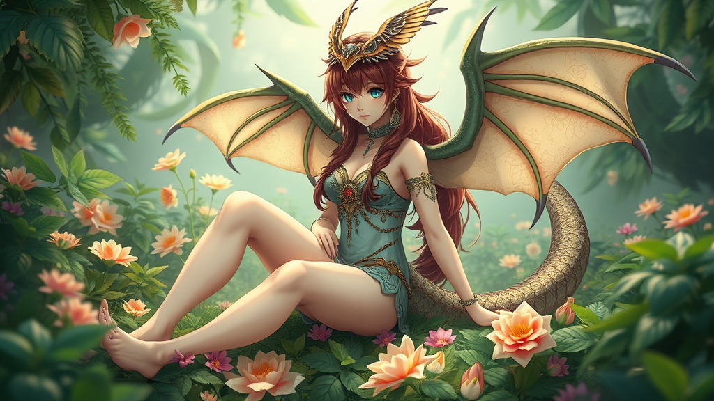 Fantasy girl dragon pose, elegant legs stretched out amidst a tapestry of green foliage, vibrant flowers blooming beneath her, cascading dragon wings, soft freckled skin, delicate filigree adornments, observing with piercing anime eyes, wearing an eagle-inspired headdress woven with a single falcon wing feather, Komodo-styled leg stance, mystical glow emanating from her, set against a dreamy, soft focus, fantasy-inspired landscape.