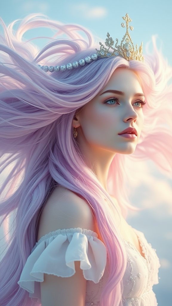Fantasy monarch of the sky with flowing clouds for hair photorealistic style natural lighting macro lens effect delicate lavender hue complemented by fresh mint tones full body portrait in soft pastel palette ivory skin depth of field accentuating ethereal presence aspect ratio 1:2 version 4 style level 1000