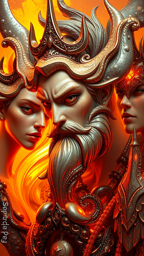 Fantasy painting in a vibrant art gallery showcasing exquisite character illustrations, featuring a palette of shimmering silver and warm amber hues, hyperrealistic in detail with captivating charm. The characters are portrayed with light gold and deep red undertones, each exhibit expressing intricate and emotive expressions, while sculpted with the precision of ZBrush artistry. The scene captures a magical allure and vivid detail that draws viewers into a world of imagination and artistry.
