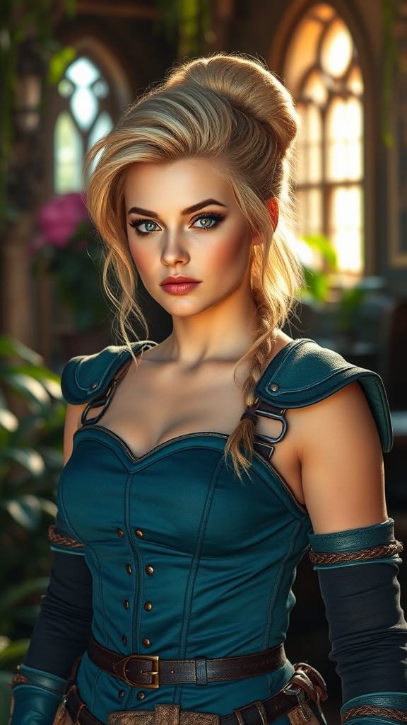 Fantasy portrait of a stunning young woman, her blonde hair elegantly styled in an upswept updo. She embodies the essence of a medieval RPG swashbuckler rogue, her teal armor and corset shirt perfectly tailored to her adventurous spirit. Indoors, the setting is an enchanting, overgrown room, where bright morning light streams in from the side, illuminating her poised and confident expression as she stands alone, ready for her next quest.
