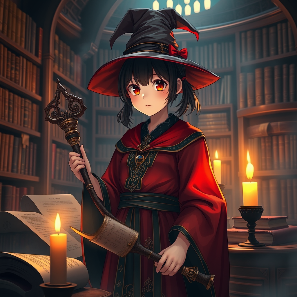 fantasy scene of a single girl with twintails and very short black hair, wearing a red and black Arabian-inspired robe in a magical library setting. She holds a mystical staff and is surrounded by glowing magic scrolls. A classic witch hat sits atop her head. The atmosphere is illuminated by the warm glow of a candle, capturing the rich, detailed textures of the 8k UHD HDR environment. The character remains the focal point, avoiding any mutations, duplicates, or facial imperfections. The image is crisp and clear, free from low resolution, out-of-frame elements, blur, jpeg artifacts, watermarks, logos, or text disruptions.