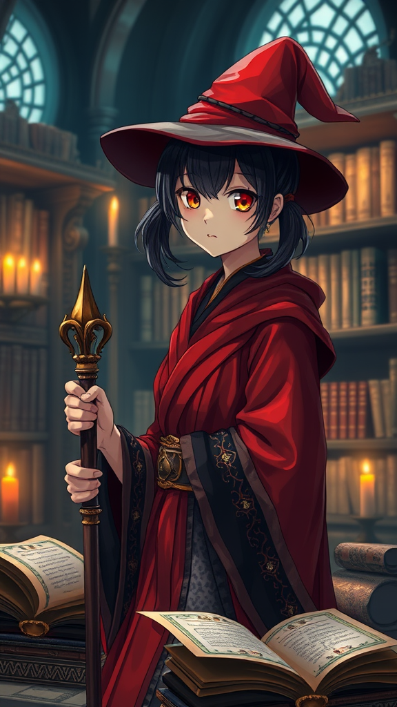 fantasy, single girl looking at viewer, short black hair styled in twintails, dressed in a red and black robe inspired by Arabic fashion, holding a magic staff, surrounded by ancient scrolls, wearing a witch hat, situated in a mystical library lit by candlelight, portrayed in 8k UHD quality, vivid HDR colors, ensuring clarity and detail. The character is shown with expression of curiosity and magic, without distortions or imperfections.