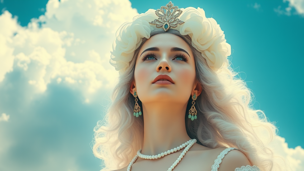 Fantasy sky empress with cloud-like tresses photorealistic natural illumination macro lens frida kahlo essence soft baby blue hue mint tone pastel shades white elements smooth skin depth of field aspect ratio 1:2 version 4 stylize level 1000